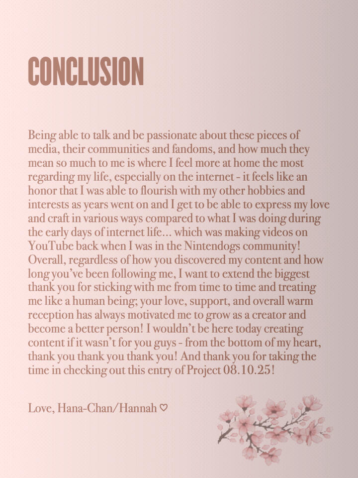Project 08.10.25 is a project that I want to make to commemorate a huge milestone in my internet life, which is the fact that this year will mark 15 years of fun, creativity, and growth - I’m looking forward to celebrating and acknowledging the journey that I’ve made along the way! Regardless of how you discovered me and what you followed me for, whether you’ve followed me since the very beginning, the middle of it, or the present day, I can’t thank you enough for sticking with me from time to time and treating me like a human being; your love, support, and overall warm reception has always motivated me to grow as a creator and become a better person! I wouldn’t be here today creating content if it wasn’t for you guys - from the bottom of my heart, thank you thank you thank you! This one’s for you, and I hope you stick around looking forward to this project!